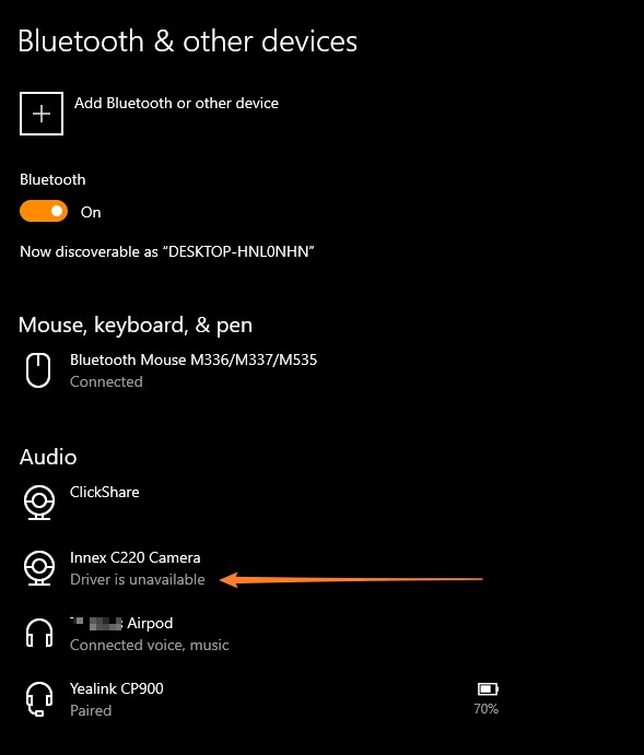 If your C220 has firmware prior to the 2021 Sept. 27th release, it might be shown as “Driver is unavailable” in Audio under Bluetooth & other devices setting.